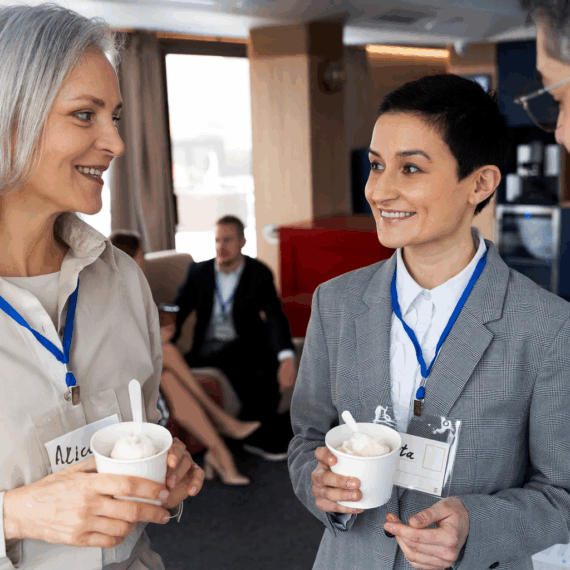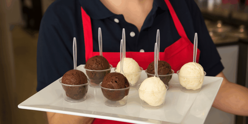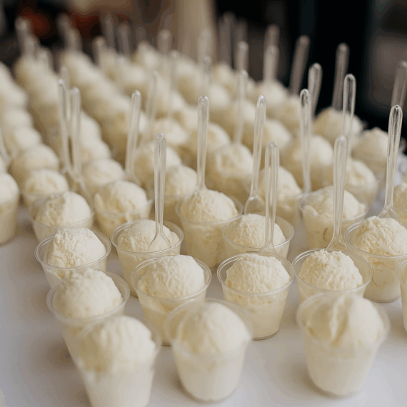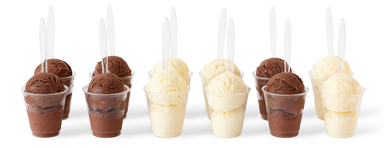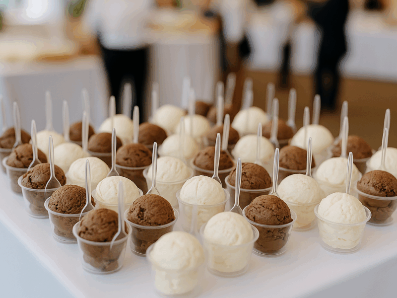 Our full-service catering transforms your event space with professional-grade tabletop freezers that maintain the perfect serving temperature, creating an elegant presentation. Our trained scoopers arrive with everything needed to serve your guests efficiently and professionally, allowing you to enjoy your event while we handle the dessert service.